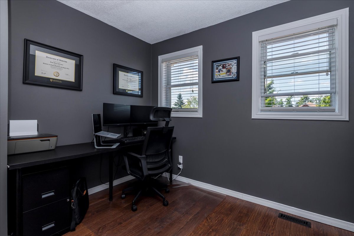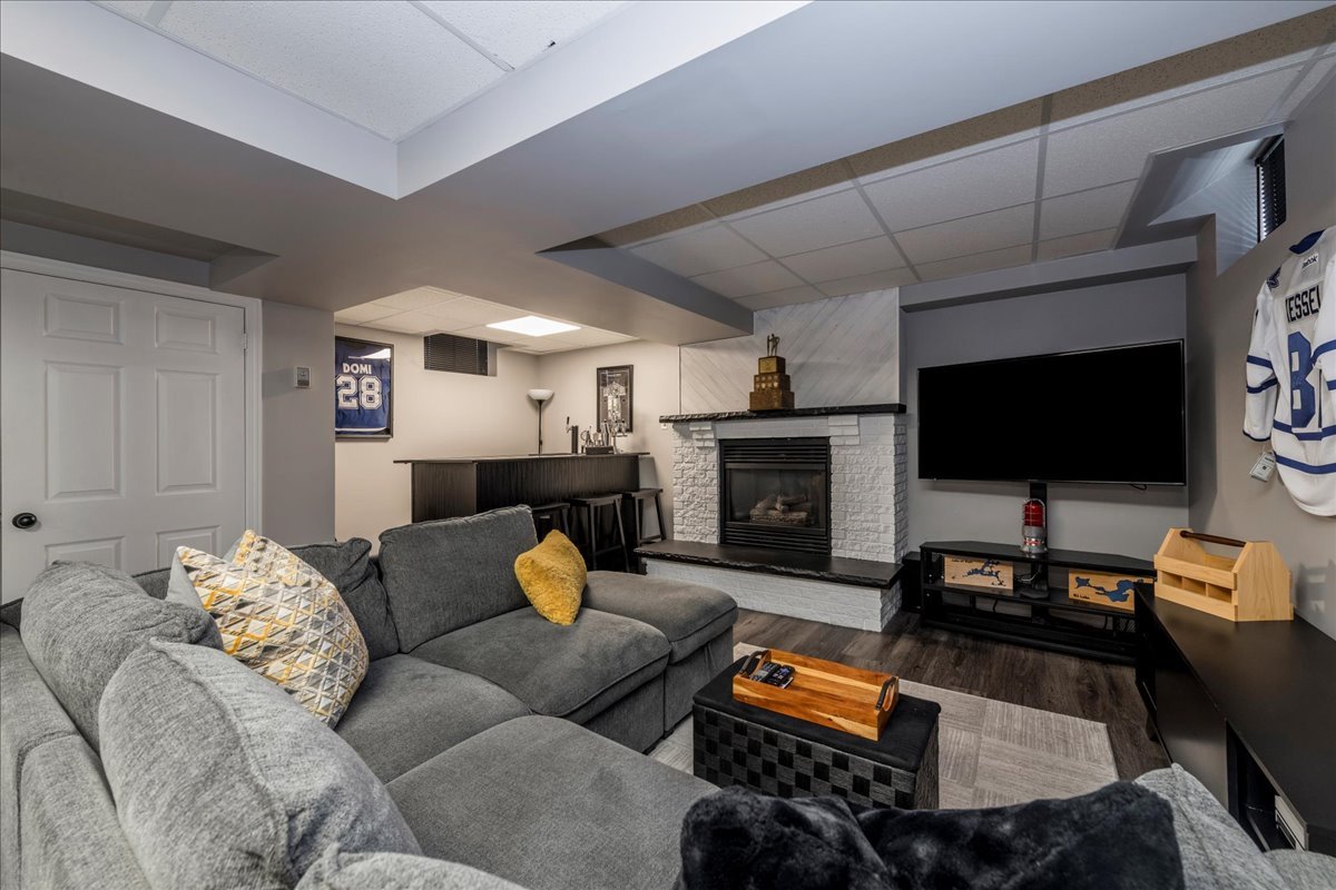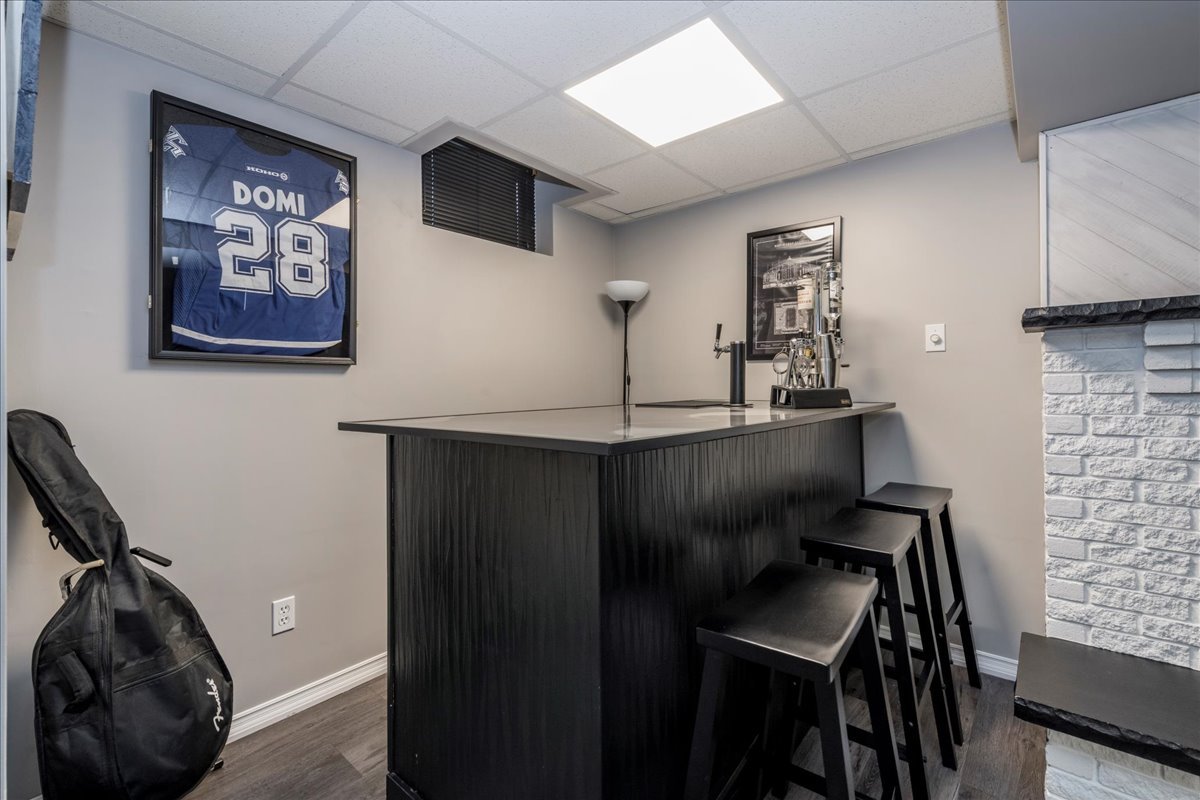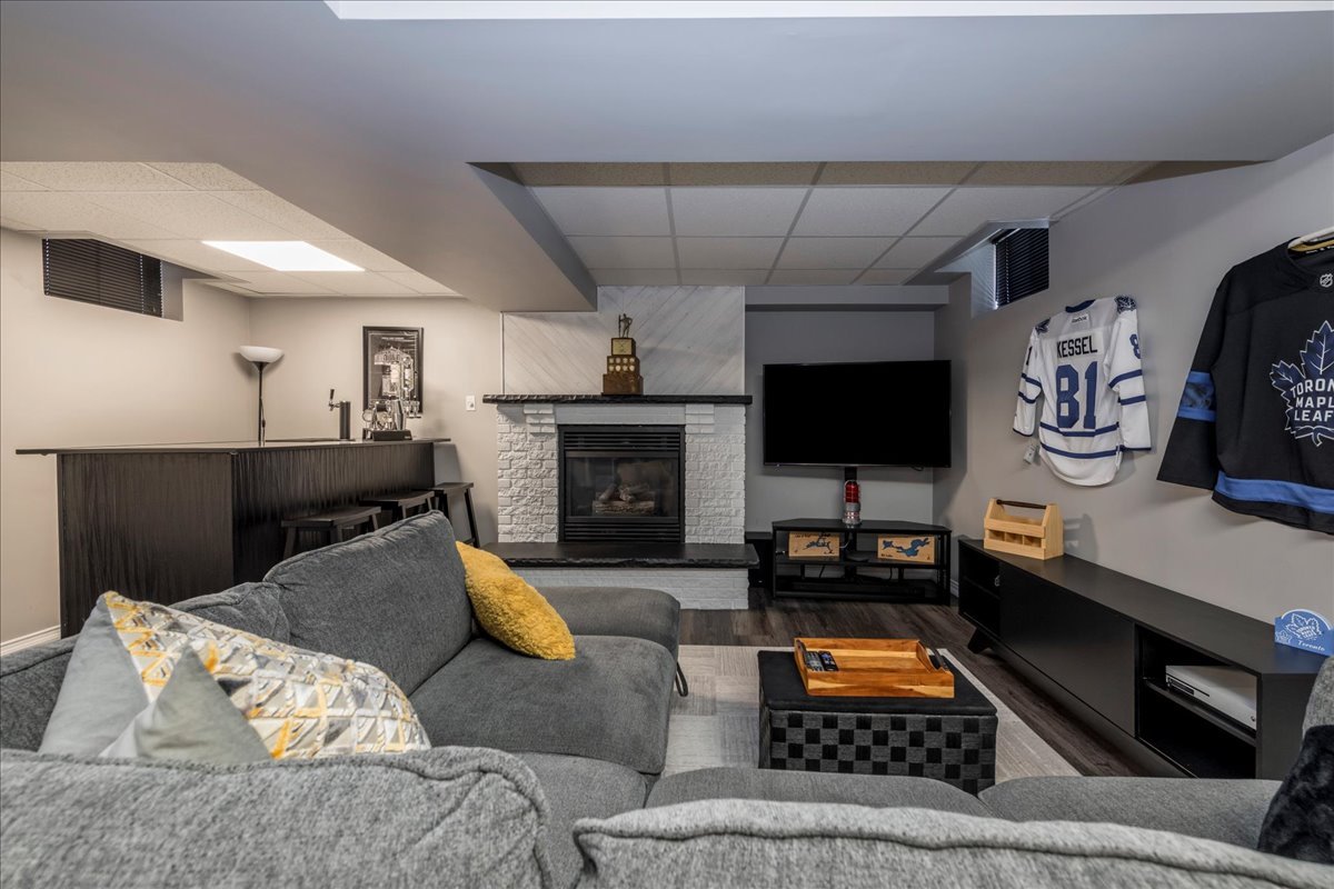 Charming 1,250 Sq. Ft. Two-Story Home on a Quiet Crescent. Welcome to this beautifully maintained two-story home located in a peaceful, family-friendly crescent. Featuring 1,250 sq. ft. of stylish living space, this home offers comfort, functionality, and modern upgrades throughout. The main floor welcomes you with a ceramic-tiled foyer, a spacious front entry, and a bright living room with durable laminate flooring. A two-piece powder room adds convenience, while the updated kitchen boasts quartz countertops, a subway tile backsplash, and matching laminate floors. The dining area is perfect for family meals, with direct access to a large deck and a pie-shaped backyard ideal for entertaining or relaxing. Gas hookups are ready for your BBQ and stove. Downstairs, the finished basement features a generous rec room with a cozy gas fireplace, a custom bar with a kegerator, a laundry area, and a large storage closet. Upstairs has a fully renovated four-piece bathroom. The spacious primary suite spans the entire second floor, while two additional bedrooms offer ample space, all with laminate flooring. Additional features include a garage with an included fridge and great curb appeal in a quiet, established neighborhood. This move-in-ready home is the perfect blend of style and comfort.