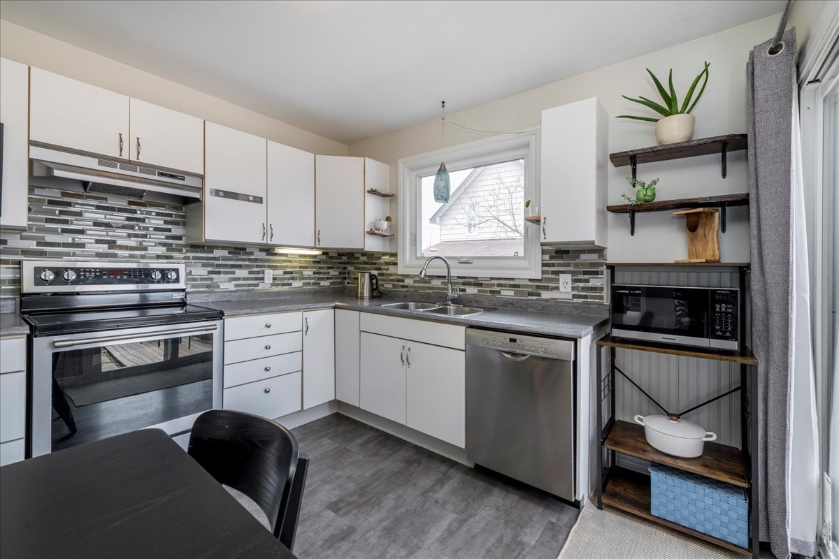 Welcome to this spacious family home offering a fantastic layout and numerous updates! Featuring a granite foyer with inside access to the garage, this home boasts newer windows (2019) and durable laminate flooring throughout the living and dining areas. The bright kitchen includes laminate flooring, newer counters, and a walkout to the backyard with a new deck & stunning views of the garden and farmers’ fields. Upstairs, the second level offers hardwood flooring in the hallway and a ceramic-tiled bathroom. The master bedroom includes a walk-in closet & ensuite bathroom & a walkout to the deck. A full bathroom with a quartz countertop is located on the third level, alongside a generously sized bedroom with a large closet. The main floor has a cozy rec room with gas fireplace, large window, walkout access to the backyard, bedroom, and a 4-pc bath. The fully finished lower level provides a great in-law suite opportunity, complete with a kitchenette, additional bedroom, and cold storage. Other notable features include a brand new 50-year roof (April 2025), a 2019 furnace, and an oversized two-car garage. Conveniently located close to shopping and amenities. Don’t miss out on this versatile and beautifully maintained home!