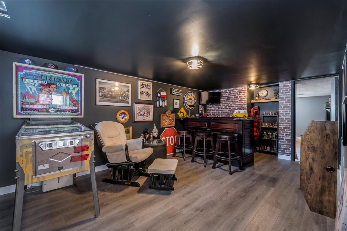 The main bathroom offers a double quartz vanity, glass shower with porcelain tile surround, and a luxurious rainfall showerhead for a spa-like experience. The third floor presents a versatile loft-style recreation room with a cathedral ceiling, dedicated office space, and extensive lighting, making it ideal for relaxing, working, or entertaining. Step outside to a fully fenced backyard with durable 6 x 6 posts and a matching shed, providing privacy and additional storage. Extensive updates completed in 2024 and 2025 include a new furnace, steel roof, windows, doors, flooring, trim, kitchen, bathrooms, and full basement waterproofing. Meticulously renovated, this move-in-ready home delivers space, style, and quality with no detail overlooked.
