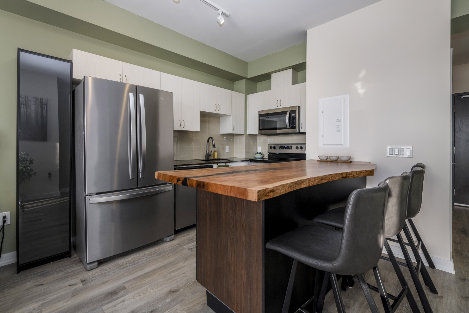 Enjoy a private 162 sq. ft. terrace style balcony and an open-concept layout featuring granite countertops, a striking live-edge island, laminate flooring, and stainless-steel appliances. Flat ceilings add a clean, contemporary feel, while the spacious bedroom includes a walk-in closet and a private four-piece ensuite. In-unit laundry adds everyday convenience, and the home is pet-friendly with low condo fees.