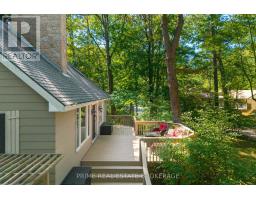 Attention downsizers, upsizers, cottagers, investors - this 3-level, 4-bed, 3-bath, 2,454 sf home is a short 10-min stroll to multiple private, deeded beaches, where soft sand, clear waters & world-famous sunsets await. Welcome to a fully furnished Muskoka-inspired retreat, located on a cul-de-sac in Grand Bend's desirable Southcott Pines, and steps from Southcott's river trail & Brewster Park, great for kids. The home is beautifully nestled beneath a canopy of old-growth Oaks on a desirable corner lot with no neighbors on 2 sides. Timeless curb appeal sets the stage with a stamped concrete driveway framed by stone light pillars. Inside, a lodge-style 2-story great room takes centre stage with a soaring fieldstone fireplace (new gas insert!), a pine cathedral ceiling & rich pine flooring. The spacious kitchen features a granite island, stainless steel appliances, warm timber cabinetry, a built-in beverage fridge, prep counter & glass sliding doors that open to a dining deck for seamless indoor, outdoor entertaining. The main floor offers a primary bedroom retreat with glass sliding doors & 3-peice bath. A second level elevated catwalk overlooks the great room and leads to 2 more bedrooms & 5-piece bath. The fully finished walkout basement has a 2nd gas fireplace, 4th bedroom with glass sliding doors & 4-piece bath. This property is designed for year-round entertaining with multiple large decks, custom firepit, several entertainment zones & 5 entry points, allowing guests to flow through the home and property with comfort & ease. The home is heated by 2 gas fireplaces with backup baseboard & 2 ductless air conditioning units cool the whole house. This turnkey home is within walking distance of beaches, downtown Grand Bend, trails, amenities & comes with a special pass for deeded beach access - map in photos shows deeded beach locations. Autumn & winter are also equally as spectacular as summer in Southcott! Vacant possession & flexible close, comes fully furnished! (id:50886)