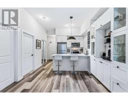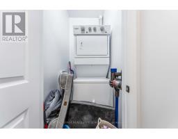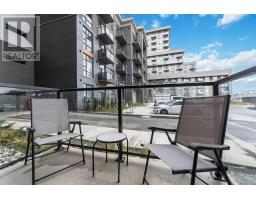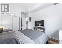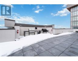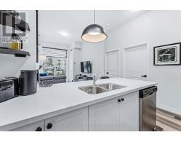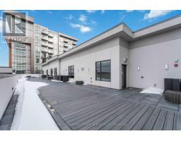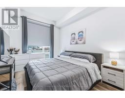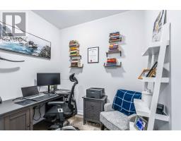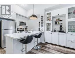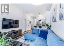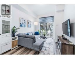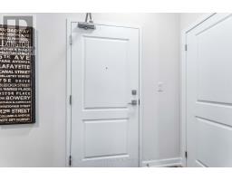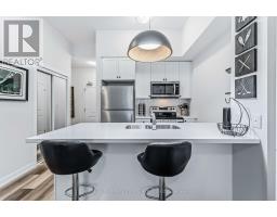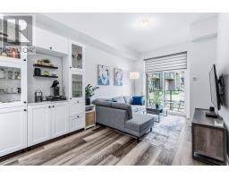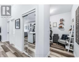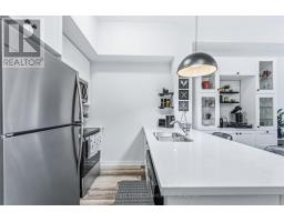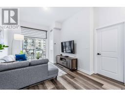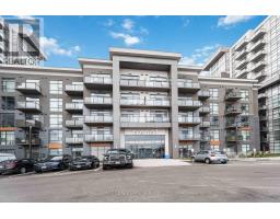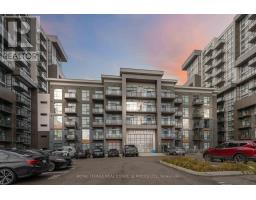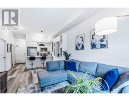 Experience modern living with this stunning 1-bedroom + den residence. The heart of the home is a modern, open-concept kitchen featuring a quartz peninsula island, subway backsplash, stainless steel appliances, and upgraded lighting. This flows seamlessly into a living and dining area defined by luxury vinyl plank flooring, a custom wall cabinet structure, and electric blinds, all leading to a sun-filled balcony walk-out. Beyond the main living space, you will find a versatile den perfect for a home office, a foyer with double mirrored closets, a 4-piece bathroom, and a bright primary bedroom with large windows. Perfectly situated for convenience, this unit is located just steps from the elevator, garbage chute, and your storage locker. Residents enjoy fabulous building amenities including a gym, party room, and meeting room, plus easy highway access for commuters. Don't miss out on this blend of luxury and convenience! (id:50886)