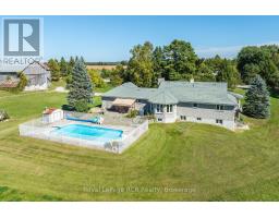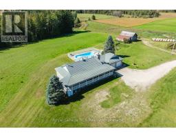Scenic 100+/- acre farm, organic for over 20 years, features a lovely stone bungalow, classic L-shaped bank barn, older shed, garage/workshop, and a private in-ground pool area. The Quality Home, built in 2000, boasts a covered wrap-around porch in a picturesque setting with double car garage and durable steel roof. Inside, the spacious layout includes a large eat-in kitchen with island and windowed nook capturing the views, a bright living room with wood fireplace, 3 bedrooms, full bath with cheater ensuite to the primary, laundry and 2-piece bath. The lower level has lots of storage, an office, walk-up to the garage, plus a 2-bedroom in-law suite with bathroom, living room, walkout to patio, and room for a kitchenette. Highlights include abundant windows, newer appliances, central vac and central air. Outdoors, enjoy the fenced in-ground pool with patio and retractable awning, perfect for gatherings. The bank barn is ideal for cattle and hay storage, plus there is a shed and garage/workshop. Mature trees, fenced pastures, and scenic fields complete this peaceful setting just minutes from town. Grey County lists the property at 100.14 acres while tax bill states 98.9 acres. Approximately 55 workable. (id:50886)