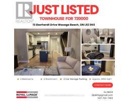 Welcome to 13 Eberhardt Dr, Wasaga Beach a RARE opportunity to Own a beautifully designedModern 4-bedroom, 4-washroom, Double Car Garage executive END Unit townhome just minutesfrom downtown Wasaga Beach and the Main Beach Area. Only 2 plus year NEW Luxury Home offersmodern living in a prime location. The home features a Master Bedroom on the Main Floor with alarge Master Ensuite which is not easy to find. There is a Separate 2 Pc Washroom on the Main Floor,and another Master Bedroom with ensuite on the Upper Floor and 2 additional Bedrooms and a bigsize Loft that can be used as Office Space. Family Room has a very High Ceiling. The home has an openConcept Kitchen with Granite Countertops and a living space that opens to a wonderful backyard thathas no neighbours for your privacy. This spacious and stylish home is perfect for all kinds of familiesyear-round living or for vacation living. Enjoy the elegant finishes in the home from oak stairs to glassdoors in the washrooms, chefs kitchen and the bungalow feeling in a town home with a 2-car garageand a 2-car driveway! You can live in a trendy neighbourhood and experience the unbeatable charmof living steps away from the finest dining and entertainment in Wasaga Beach. (id:50886)