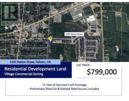Excellent small-scale development opportunity in the heart of Fonthill. This 0.29-acre property offers 71' of serviced frontage and includes $180,000 in development charge credits. With fewer than 10 units, the site can proceed without site plan control, offering a streamlined approval process for builders and developers. Preliminary concept plans show 8 stacked townhouse units, with potential for alternate layouts or freehold residential development. Zoned Village Commercial, the property allows for a wide variety of permitted uses, including: apartment dwellings, townhouses, bakery, restaurant, retail, offices, hotel, microbrewery, cultural use, live-work units, and short-term accommodation, among others. Ideally located within walking distance to Fonthill Town Square, shopping plazas, restaurants, grocery stores, LCBO, schools, churches, parks, and the Meridian Community Centre with its new arena and recreation facilities. (id:50886)