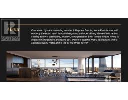 Experience Luxury Living at Nobu Residences Welcome to Suite 1410 at the world-renowned Nobu Residences, a stunning 2 Bedroom + Den and 1 Parking, 2 Bathroom southwest corner unit with parking and a private balcony. Offering 890 sq.ft. of total space (862 sq. ft. interior + 28 sq. ft. exterior)The open-concept layout features floor-to-ceiling windows, 9 ft ceilings, and a sleek modern kitchen with a Miele integrated appliance package. Bedrooms include custom closet organizers, while both spa-inspired bathrooms showcase upgraded fixtures and elegant finishes. Toronto's Entertainment District, steps from the Nobu restaurant, King West, CN Tower, Rogers Centre, and the Waterfront, this address boasts a Walk Score of 99 and Transit Score of 100. Residents enjoy exclusive 5-star amenities including a rooftop terrace, fitness and yoga studios, hot tub, business lounge, and 24-hour concierge. (id:50886)