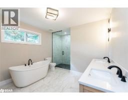 MODERN ELEGANCE MEETS NATURAL BEAUTY IN THIS FULLY RENOVATED MIDHURST HAVEN FEATURING A DESIGNER KITCHEN, IN-LAW SUITE POTENTIAL, & EXPANSIVE OUTDOOR LIVING! Set on a corner lot spanning over half an acre in the peaceful and sought-after community of Midhurst, this beautifully renovated home offers modern comfort surrounded by nature’s serenity, just minutes from city conveniences. Embrace an active, outdoor lifestyle with Crystalwood Park just down the road, along with easy access to Snow Valley, Horseshoe Valley, Vetta Nordic Spa, Copeland Forest, Simcoe County Forest trails, and several nearby golf courses. The home’s charming curb appeal continues into an expansive backyard featuring a stone patio, lush lawn, and a tranquil tree-lined backdrop that creates an idyllic outdoor retreat. A drywalled double-car garage and spacious driveway provide ample parking for family and guests alike. The open-concept layout seamlessly connects the living, dining, and kitchen areas, highlighted by an oversized window framing peaceful views of the yard and a beautifully designed kitchen with quartz counters, sleek modern appliances, and a bright, airy atmosphere ideal for gatherings. The main level hosts two generous bedrooms, including a sunlit primary retreat with dual closets, along with a luxurious 5-piece bathroom complete with a walk-in glass shower, freestanding soaker tub, and double quartz vanity, plus a stylish powder room for guests. The fully finished basement adds impressive versatility with a large rec room, additional bedroom, 3-piece bathroom, and laundry area with newer appliances, with a separate walkout entrance offering ideal potential for an in-law suite or guest quarters. Extensively renovated from top to bottom with updated windows, front door, vinyl siding, electrical, and contemporary hardwood and luxury vinyl flooring, this Midhurst #HomeToStay combines timeless style with refined comfort, offering an exceptional lifestyle embraced by nature’s beauty. (id:50886)
