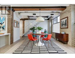 $1,036.16 MonthlyGotham Vintage Lofts. A rare and much sought after post & beam, exposed brick loft situated in the heart of King West. Formerly constructed between 1903 and 1910 to serve as a horse harness factory and later as a textile mill. After many decades of commercial activity, this 6 storey building was repurposed & reimagined in 1997 by Paul Anisman into 54 stylish vintage lofts. Recently, the apartment was completely renovated & upgraded to please the most discerning buyer. The apartment showcases 1052 sf of interior space & a rare 54 sf balcony on the 2nd floor overlooking the beautifully landscaped garden courtyard of Minto 775 complete with a fireplace & water feature. This beautiful bespoke loft showcases 2 levels, 11'10" ceilings on the main floor, a custom white metal open riser staircase leading to the second floor, 10'2" wood ceilings on the 2nd floor, white oak plank floors throughout, exposed brick, spiral ductwork, large windows, a walk-in front closet complete with stacked washer/dryer, upgraded lighting throughout. The numerous bespoke finishings continue to showcase a custom kitchen boasting premium integrated appliances, quartz counter & backsplash, centre island & a breakfast bar. The stylish contemporary baths showcase large format tile, custom vanities, upgraded light & plumbing fixtures, the ensuite boasts a large W/I shower, frameless glass enclosure, rain shower, handheld water wand, concealed indirect lighting & a walk-in closet featuring built-ins. No stone was left unturned, new furnace & AC unit. The building features a handsome lobby, 2 elevators, a gym, meeting rooms & visitor parking. The nearby neighborhood amenities are endless; TTC 504 & 511 street cars, future Ontario Line subway stop at King & Bathurst, Fort York, Coronation Park, the waterfront trail, Stanley Park complete with outdoor pool, recreation field & off leash dog park, shops, restaurants & cafes of King West, Queen West & Liberty Village. 1 parking & 1 locker. (id:50886)