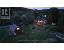 Nestled in the drumlins North of Belleville, just 35 minutes from PEC, lies Halloway, a hamlet steeped in history and rural charm. Once a bustling stop along the Grand Junction Railroad, it was home to general stores, mills, and artisans. Today, that same sense of heritage endures in the character homes that dot the landscape. Here, the land rises and falls with striking elevation, offering dramatic views and a rare sense of seclusion so close to the city. Set on more than 2 acres of this countryside is a circa 1920 farmhouse, a timeless two-story that radiates warmth. A welcoming wrap-around porch invites you to pause and take in the views, while a gentle creek winds through the property, joined by a tranquil pond. At the rear, a tucked-away fire pit creates the perfect spot for campouts or evenings beneath the stars. Inside, rustic details pair beautifully with modern touches. Exposed beams, stone accents, and wood plank flooring bring charm throughout. The open-concept main floor flows easily from living and dining into a generous kitchen with a massive island, vaulted ceilings, and a cozy wood-burning stove. Step out to the multi-level patio - an entertainers dream with built-in BBQ, perennial gardens, and even a playful tee box for practicing your short game. The main floor also offers a den or office connected to a spa-inspired bath with Jacuzzi tub, glass-and-tile shower, and heated floors. Upstairs, three bright bedrooms continue the inviting feel, with the primary enjoying semi-ensuite access. A 40' x 26' heated detached garage with 11' ceilings, loft bar and lounge, its own driveway, and separately metered 200 amp service is ideal for a contractor, hobbyist, or home business, with potential for a secondary dwelling. Just two minutes away, the Trail of Two Lakes links Belleville to Madoc, offering miles of hiking, biking, snowmobiling, and ATV adventures. Recent updates include a new septic system (2020) and a wood stove chimney (2021). (id:50886)