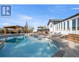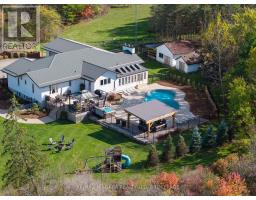 Welcome to this exceptional country estate, set on over 8 acres of picturesque, gorgeously landscaped land. From the moment you arrive the property will impress you, with its long winding driveway, which passes by a beautiful natural pond with a fountain, a fabulous resort-like back yard with multiple sitting areas, an inground pool, & a hot tub. Step inside to an inviting open concept main level, featuring a gorgeous chef-inspired kitchen with soaring high ceilings, premium finishes, and a seamless flow into the bright living & dining areas. A wonderful sunroom with heated floors offers year round comfort, & is the perfect place to unwind while enjoying panoramic views of the property. The main level boasts four large bedrooms, including two luxurious suites, each with an ensuite bathroom & walk-in closet-ideal for family living, or hosting in style. There's also a 4 pc bath & a 3 pc shared bath on the main level, along with a convenient laundry room off the garage. The lower level is designed for versatility & entertainment, offering a family room, a fifth bedroom, & an in-law suite, that's perfect for your extended family to have their own space. It features a large bedroom, an updated washroom with stackable laundry, a spacious kitchen/living/dining area, & a separate walk-up to the side yard. There is a door from the suite to the rest of the basement, so you could use the entire space for your own immediate family as well. Just a few of the upgrades include: hot tub '22, metal roof '22, stucco '22, approx. 2 acres of irrigation system & landscape lighting & underground dog fence, many new windows, kitchen, flooring, & baths. Outdoors, the possibilities are endless, whether enjoying the heated pool (new liner '22), entertaining on the expansive patios & deck, simply soaking in the peace & beauty of country living, or exploring the acres of woods & skating on the pond in winter. Truly a one-of-a-kind property offering space, luxury, & unmatched tranquility! (id:50886)