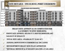 Attention Builders! Ready-to-build 78-unit apartment site in booming Niagara. Draft approved, CMHC Financing Eligible, minutes to downtown, beaches, and new $3.6B hospital. Rare $32K/ per door opportunity- act fast! An exceptional opportunity for builders and developers to secure a fully draft site plan approved apartment project in Port Colborne, one of Niagara's fastest-growing communities. This 1.14-acre downtown commercial site is approved for a 6-storey, 78-unit building (approx. 76,000 sq.ft. GFA) with 86 parking spaces and a modern mix of 1- and 2-bedroom layouts. Qualifying for CMHC financing, the project allows investors to maximize leverage and long-term stability. Port Colborne is on the rise, with nearly 25% population growth projected by 2031, the new $3.6B South Niagara Hospital opening in 2028, and a booming tourism economy with 70+ cruise ship visits in 2025. At just $2,500,000 (~$32,051/door), this rare, shovel-ready site offers approvals, incentives, and unmatched growth potential in one package. (id:50886)