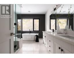 Brand new, never lived-in custom home in Burlington's desirable Shoreacres community. Set on a tree-lined street and backing onto a park, this residence delivers more than 5,600 square feet of beautifully finished living space and a design defined by craftsmanship and natural light.Enter into the grand foyer with 20' ceiling, 10-inch baseboards, and 7-inch engineered floors throughout the main level, complemented by in-ceiling speakers and radiant in-floor heating. A front-facing office with 12-foot ceiling, feature wall, and two-sided fireplace offers a refined space to work or study.The open-concept great room centres on a porcelain-clad gas fireplace flanked by custom built-ins, flowing seamlessly into a bright white kitchen featuring JennAir appliances, two sinks, a waterfall quartz island, and matching quartz backsplash. Sliding glass doors open to a covered porch with built-in barbecue overlooking the park-a perfect setting for year-round entertaining.Upstairs, four spacious bedrooms each enjoy their own ensuite. The primary suite includes a walkout terrace, feature wall, and spa-like ensuite with freestanding Mirolin tub, rain and wand shower, and dual vanity.The finished lower level impresses with radiant in-floor heating, a generous walk-up to the backyard, gym, fifth bedroom, steam shower bath, wet bar, theatre room, and recreation area.A rare combination of architectural quality, modern comfort, and family function-all within an exceptional school catchment. Tarion warranty. (id:50886)
