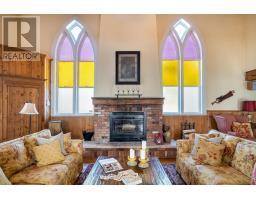 When you step inside this unique, renovated 1897 church, you can't help but imagine the fabulous holidays your family and friends would enjoy here. On the main street of the charming village of Nottawa, this is a home meant for gathering. This rare opportunity is absolutely full of thoughtful touches and decor lavished on it by its current owners, and all those touches are included in the sale. Furnishings, linens, rugs, art, lamps, antiques, even the dishes, all come with the house so moving in will be easy. Your family will enjoy the restful and restorative atmosphere of the main floor with the soft light of stained glass. The sprawling living space under post and beam cathedral ceilings has a chalet like feel. It features a primary seating area in front of a wood burning fireplace with a wonderful long and welcoming bar for entertaining. The bar itself was recovered from an old general store. An adjoining space houses another seating area in front of a gas fireplace and a large billiards table. The dining table seats 14 so no card tables will be necessary. Each space is wide open yet beautifully defined with a combination of historic details and new improvements. You will have room for all your guests in the five upstairs bedrooms, all stylishly decorated and all enjoying the comforting glow of stained glass windows.The main floor den has a pull out sofa bed and an ensuite bathroom for additional sleeping quarters. It is a home to wander in, explore, and bask in its warmth and coziness. Outside, a large backyard deck allows space for an oversized bbq and an enormous hot tub, all under a beautiful canopy of mature trees. Multiple sheds for storage and potting make maintenance easy -- and even the garden equipment is included. (id:50886)