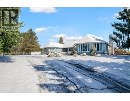 Tucked away on over 18 acres of tree tranquility, this sprawling brick bungalow is more than a home, it's a lifestyle. A grand circular driveway and wide covered porch framed by elegant hip rooflines welcome you into timeless elegance and everyday comfort. The foyer opens to an open-concept layout. The chef's kitchen boasts rich wood cabinetry, granite counters, a spacious island with extended bartop seating, and built-in stainless steel appliances including wall oven, gas cooktop, and integrated barista station. A sunlit window over the sink frames peaceful country views. Tile flows into the kitchen while hardwood with custom inlay defines the expansive great room with custom built-ins and cozy fireplace. Patio doors from the great room & dining room open to a glorious sunroom drenched in natural light, with access to a large deck for seamless indoor-outdoor living. A spa-like retreat with hot tub offers panoramic views of your treed oasis. The main level includes 2 generous bedrooms, highlighted by a luxurious primary suite with walk-in closet, fireplace, spa-inspired ensuite with dual sinks and custom shower, plus private deck access. A second 4-pce bath, dedicated laundry, and wide hallways complete this level. The fully finished lower level expands your options with a rec/games room and fireplace, gym, wet bar, home theatre, den/bedroom, cold storage, 3-pce bath, and workshop/hobby space. The opposite wing hosts 2 private 1-bedroom in-law suites, each with living room, kitchen, 4-pce bath, private side-door entry, shared foyer, and laundry, ideal for extended family, guests, or income. Outdoor living shines with 2 decks, a large covered porch, and a 3-car garage with inside access to both levels. Peace of mind comes with a whole-home generator 2023, geothermal heating/cooling, fibre internet, and 4 fireplaces. The treed acreage invites endless possibilities: create your own walking trails, enjoy snowshoeing or skiing, ride horseback, or cultivate a hobby farm. (id:50886)
