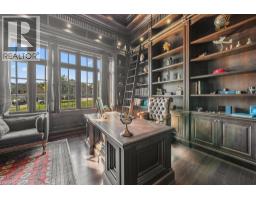 A Masterpiece of Craftsmanship and Permanence! Nestled beside a protected natural landscape with scenic year-round views of the Grand River, 546 Woolwich Place offers artistry, luxury, and privacy. With direct private access to the Grand River Trail from its gated yard, this home stands as a true legacy estate. The exterior features hand-chiseled Indiana limestone, an Enviroshake hurricane-rated roof, and a custom 9' African Mahogany front door. Professionally designed lighting highlights the architecture, while mature landscaping—boxwoods, maples, and walnuts—thrives under a six-zone irrigation system. Two driveways add rare functionality. Inside, every detail reflects craftsmanship. Solid wood architraves, 9.25 baseboards, and solid wood doors with platinum hardware set the tone. Exotic Red Laurel and Cocobolo hardwood floors flow throughout, anchored by a grand maple staircase with wrought iron railings. Radiant floor heating provides year-round comfort. Elegant plaster crown mouldings, Swarovski Schonbek chandeliers, and natural gas fireplaces enhance the ambiance. The primary suite is a spa-like retreat with book-matched Carrara marble, steam shower with body jets, two-person tub with Rubinet Swarovski crystal fixtures, and a linear fireplace set in Turkish stone. The powder room shines with platinum-infused Italian tiles and Swarovski sconces. A custom cherrywood study, crafted by artisans who built for notable successful Canadians, features 13' coffered ceilings and a Texas Longhorn leather-inset desk. All cabinets throughout the kitchen, laundry, and primary bedroom are Downsview cabinets. Wellness amenities include a Western Red Cedar sauna with cold plunge. A heated 900 sq. ft. triple-car garage with insulated cedar doors, smart home monitoring, and a Viessmann boiler system complete this extraordinary home, where timeless craftsmanship meets modern luxury amid unobstructed river and waterfront views. (id:50886)