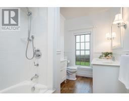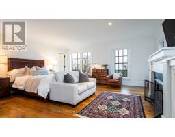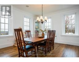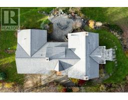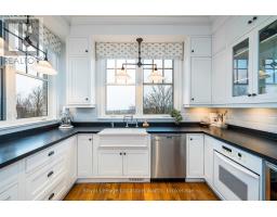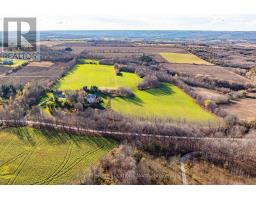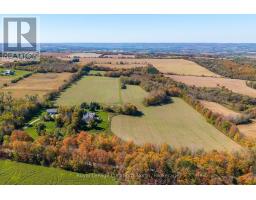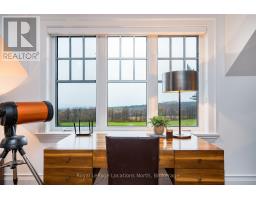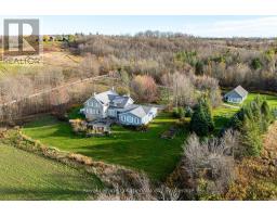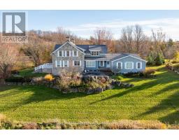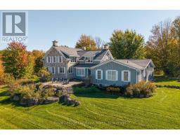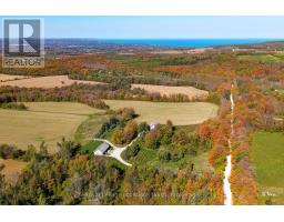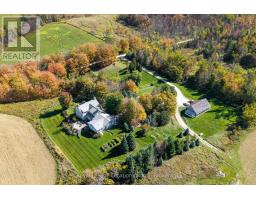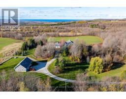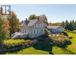 Exceptional 50-acre country estate in The Blue Mountains offering privacy, craftsmanship, and panoramic Georgian Bay views. Custom-built in 2007 by Peter Schlegel, this 6,500 sq. ft. stone farmhouse embodies the elegance of an authentic Ontario homestead with refined modern comforts. Designed with care and incorporating reclaimed materials from the original farmstead, the result is a timeless home of warmth and distinction. Wide-plank, pegged hardwood floors, slate, and tile accents, along with custom crown mouldings, set an elegant tone. Two Rumford wood-burning fireplaces and two gas fireplaces add charm across formal and informal spaces, including a welcoming living room, family room, and dining area. The well-appointed kitchen features custom cabinetry, stone counters, and fine finishes. The main-floor primary suite features a gas fireplace, a walk-in closet, and a spa-inspired marble ensuite with a claw-foot tub and glass shower. Upstairs offers four bedrooms, plus a large flex room that is ideal as a fifth bedroom, office, or lounge. The finished lower level has a recreation room with a bar, a living room with a gas fireplace, and a 700-bottle wine cellar. Manicured gardens and a 34' x 33' flagstone terrace overlook rolling fields toward Georgian Bay. The Bruce Trail is just steps away for hiking and exploration. The property includes an attached double garage and a detached 50' x 30' drive shed with two bays, a heated studio, a powder room, and a greenhouse. Approximately 30 acres of organic fields and 15 acres of forest, which include streams and a seasonal karst spring/waterfall. Geothermal heating, a 400-amp service, and a generator ensure year-round comfort. Fifteen minutes to both Collingwood and Thornbury. (id:50886)