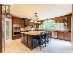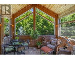 This 6,067 total sq. ft. European-inspired residence, thoughtfully designed by The Barnswallow Company, embodies timeless appeal, enduring craftsmanship, artistry, and refinement. Positioned at the top of Eagletrace Drive's prestigious cul-de-sac, this property enjoys the rare privilege of backing onto Medway Heritage Forest & ravine. The striking stone, stucco, and brick facade is complimented by a forecourt with manicured lush gardens and a sculptural water feature. The grounds unfold into a resort-style retreat with an in-ground saltwater pool, screened veranda, walkout partially screened loggia, raised terrace, serene waterfall, thriving pond, and an armour stone fire retreat, making this an extraordinary property to host. Inside, the main level exudes grandeur and warmth. The two-story great room is embellished with a cast stone gas fireplace, walnut hardwood floors, and expansive Andersen windows showcasing beautiful tree canopy views. Flow seamlessly into the expansive European-inspired kitchen, discovering embellished millwork, Cherry cabinetry, Sub-Zero fridge, Wolf, Bosch, and KitchenAid appliances, butlers pantry, kitchen pantry, breakfast nook, and a furniture style 7.4' Delicatus granite island. A formal dining room, sun-filled study, and family room with wet bar elevate the living experience. The upper level is crowned by an indulgent primary retreat - a serene, romantic sanctuary with sweeping treetop views, a lavish 6-piece ensuite with limestone, bidet & water closet, and a custom oversized dressing room with jewelry cabinetry. Three junior suites with custom closets, two with a shared 4-piece Jack & Jill, provide privacy & comfort. The lower level walkout was thoughtfully designed to bring together leisure and wellness with a recreation lounge, wet bar, sound-isolated music room, home gym with integrated sauna, craft/creative room & a thoughtfully designed in-law suite with kitchenette. Recent upgrades: Roof, furnace, AC, hot water tank (2023). (id:50886)