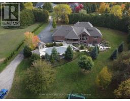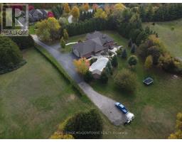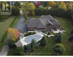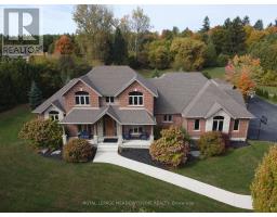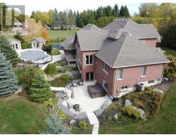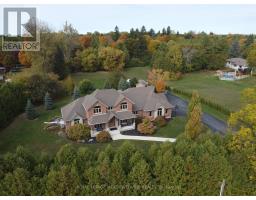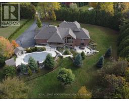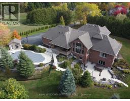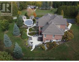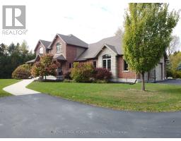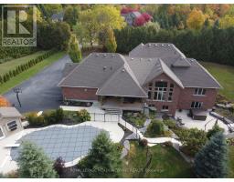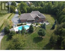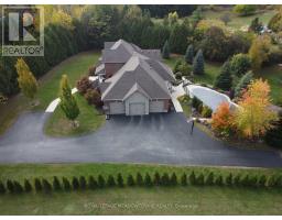 Unbeatable Location! This rare and stunning 1.66-acre property offers the perfect blend of privacy and convenience, just minutes from all amenities and the 401. Nestled at the end of a mature, welcoming cul-de-sac, this 2014 custom-built, 3+1-bedroom, 4-bathroom stone and brick bungaloft features more than 4500 sq ft of thoughtfully designed living space. Designed with family living in mind, this home boasts a spacious open-concept floor plan, with cathedral, vaulted and 9+ ft ceilings and expansive windows that flood the interior with natural light, showcasing the breathtaking views of the private, serene landscape. The main floor offers a "foodie's" granite counter kitchen accented with elegant cabinets and a massive central island. The walk out to the backyard oasis and covered deck provides stunning views. The main floor also offers a principal bedroom with a large walk-in closet and a luxurious 5 pc ensuite bathroom, a formal dining room, walk-in pantry, laundry and a dedicated office space, all designed for today's lifestyle. The finished walk-out basement adds even more value with oversized windows, 4th bedroom, a wet bar, a games & media area, a recreation room with a warming fireplace, and additional storage or potential for future expansion with a separate staircase directly from the garage. Step outside into the ultimate backyard retreat, complete with a fully fenced inground heated swimming pool (2016), a cabana, a cover deck, a hot tub and luxurious Tobermony stone landscaped patios perfect for relaxing and entertaining. Extensive, easy-to-maintain landscaping surrounds this house. This home offers practical functionality with a 3-car garage providing convenient main floor and basement accesses, including a paved driveway with 10+ car parking for family and guests. Move-in-ready homes like this, offering such a unique combination of space, style, and privacy, are truly a gem. Do not miss the opportunity to make this beautiful property your forever hom (id:50886)