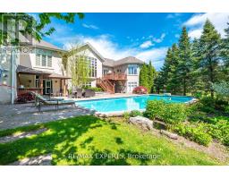 A Must-Have for Sports Enthusiasts - Previously Owned by Legendary Canadian Hockey Goaltender Curtis Joseph Welcome to this stunning executive bungalow nestled on nearly 2 acres in the prestigious enclave of Aurora Estates. Boasting over 5,100 sq. ft of pure luxury, this home features 10-foot ceilings, 8-foot doors, and exceptional designer finishes throughout. Step into the sunken living room with a two-sided fireplace, perfect for entertaining or relaxing in style. The grand primary suite offers a spa-like 7-piece marble ensuite and an enormous walk-in closet. The gourmet kitchen is a chef's dream, equipped with a Wolf stove, Sub-Zero refrigerator, and elegant custom cabinetry. The fully finished walk-out basement is a true entertainer's paradise, featuring a pub, wine cellar, gym, hockey training room, games room, home theatre, and direct access to a beautifully landscaped yard with pool, cabana, hot tub and multiple sitting areas with wood burning fireplaces. For the car enthusiast, there's also a newer detached 2-car garage in addition to the main 3 car garage. (id:50886)