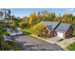 Custom built bungalow in 2012 on 1.15 Acres located just North of the peaceful Hamlet of Damascus, Wellington North. Conveniently located approximately 45 minutes north of Guelph, 20 minutes to Fergus & 10 minutes east of Arthur. Paved road access. Located on a very private property 125 ft x 400 ft property offering plenty of parking, a fantastic detached workshop heated & insulated, 12x20 garden shed, large veggie garden, and a beautiful back yard leading to a cute log cabin with a camp fire area & a little bridge over a seasonal creek. Lovely setting with a variety of trees and a haven for birds & wildlife. The front covered porch is south facing and leads to the main entrance of the home. The main floor layout is open concept with vaulted ceilings combining a spacious living room, kitchen & eating area. There are 3 bedrooms, 1-4pc bathroom, 1-2pc bathroom and a main floor laundry room with access to the attached one car garage. The lower level is finished offering radiant in floor heat, a large rec-room with a stone fireplace & wood stove, games room, 3pc bathroom, office or home gym room and a utility room. Central air conditioning and a steel roof. This home is very well laid out and makes for the perfect country beginning or downsize to the country from the farm. (id:50886)