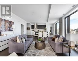 Penthouse 2305 at ArtHaus is a rare offering that elevates downtown living in every sense. This 2-bedroom, 2-bathroom corner suite boasts soaring 10-foot smooth ceilings, expansive portrait windows with sweeping views to the east and south of Ottawa, and a covered balcony for quiet outdoor moments. Inside, you'll find premium upgrades throughout: oak hardwood floors, custom window sheers, remote-controlled blackout curtains in both bedrooms, and a generous foyer with built-in storage. The kitchen is a showpiece featuring integrated JennAir appliances (including built-in fridge and wine cooler), quartz waterfall island, designer light fixtures, and exceptional storage. The open-concept layout flows seamlessly into the living and dining areas, bathed in natural light. The primary bedroom includes a walk-in closet with custom cabinetry and an elegant ensuite with rainfall shower and wand. A full-size washer/dryer and a second bathroom with tub complete this sophisticated residence. ArtHaus is an intimate, boutique residence with only 87 suites. On this exclusive penthouse floor, you're one of just four residences offering unmatched privacy in the heart of downtown. Residents enjoy a private lobby, fitness studio, rooftop terrace with fireplace and BBQs, resident lounge, and is uniquely situated atop the Ottawa Art Gallery and Le Germain Hotel, offering effortless access to downtown Ottawa's cultural and culinary amenities. A truly unique and elevated living experience awaits. Photos shown are of the unit when previously staged. (id:50886)